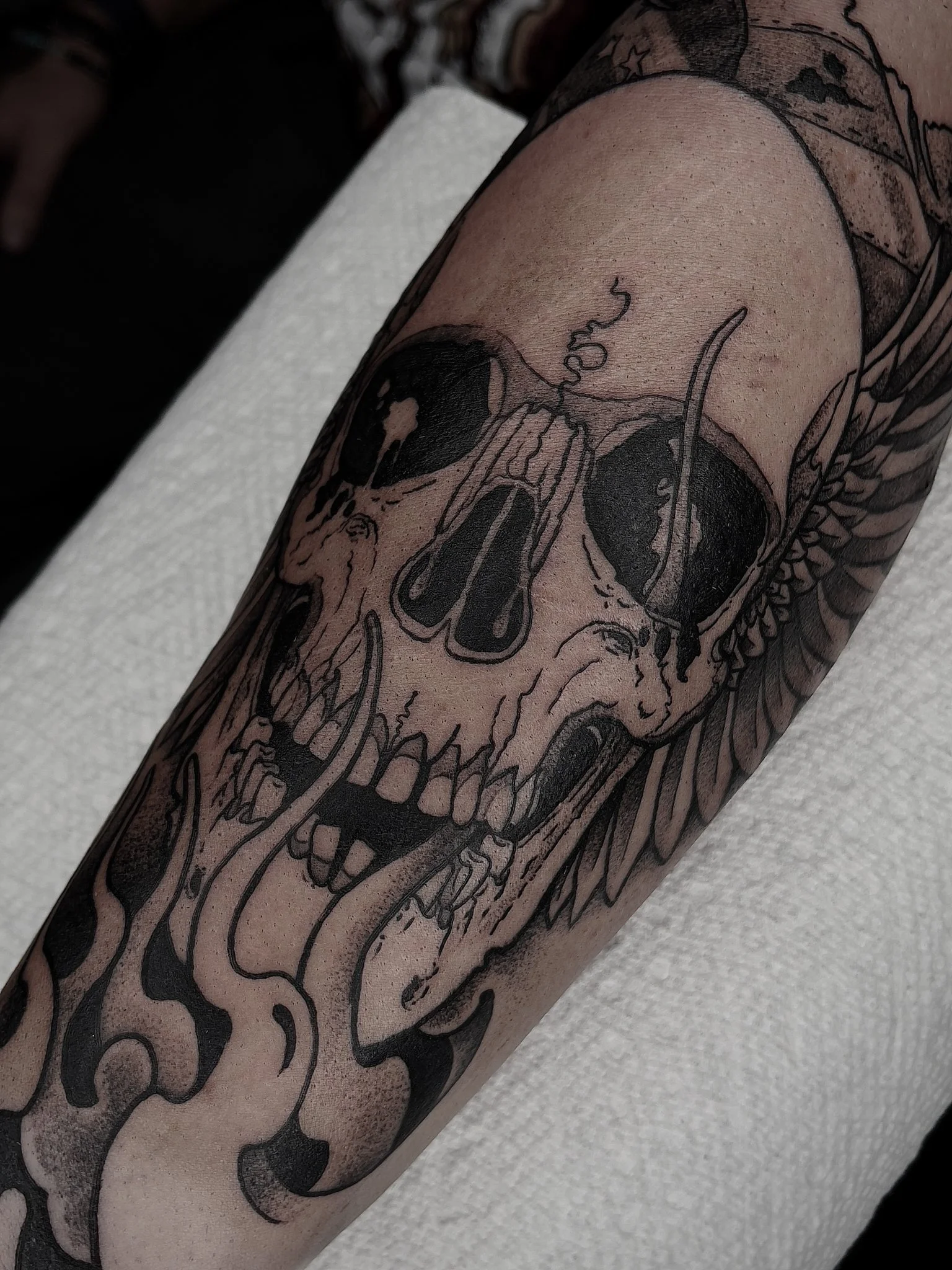 I specialize in blackwork, with a love for bold linework, high contrast, and textures built through stippling. I’m especially drawn to skulls, bugs, flowers, and other natural elements.